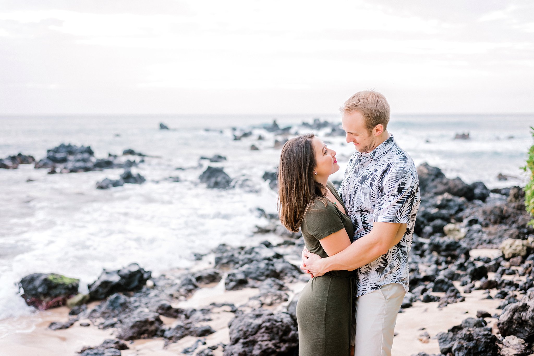 For this session, we traveled to the South side of Maui. The sunsets on this side of the island are phenomenal and I was able to capture several amazing beach portraits. White Rock beach is set away from the crowded Wailea resorts, so I love this location for its privacy. There is a wide stretch of sand and a nice mix of lava rocks and palm trees that make up a beautiful background.
